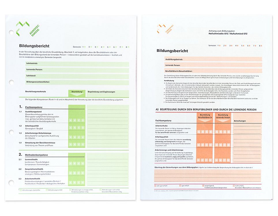 Gemäss Bildungsverordnung ist das Ausfüllen des Bildungsberichts in jedem Semester obligatorisch. Mit der Vorlage von Agrotec Suisse haben Sie das richtige Werkzeug zur Hand. Sie können die Vorlage online herunterladen oder im AM Suisse Shop (Artikel D381181) bestellen.